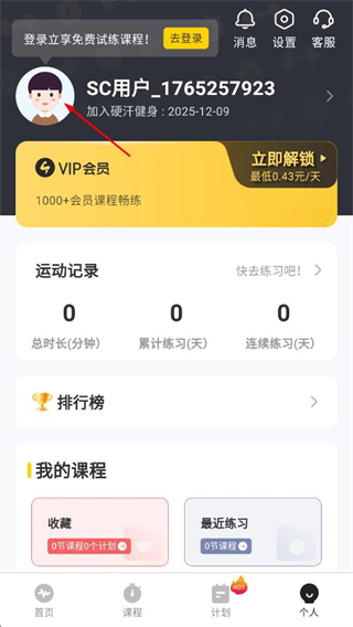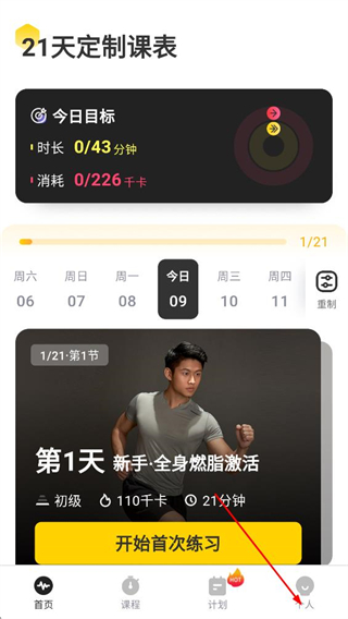 1、在健身首頁,點(diǎn)擊底部的個(gè)人選項(xiàng),進(jìn)入個(gè)人頁面。