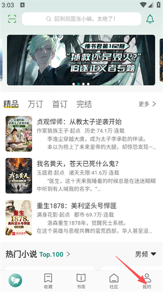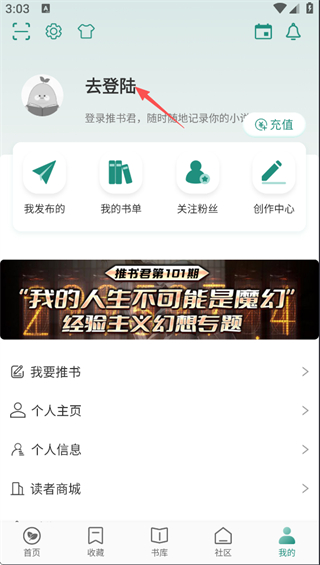 1、在推書君APP首頁,點(diǎn)擊底部的我的選項(xiàng),進(jìn)入個(gè)人中心頁面。