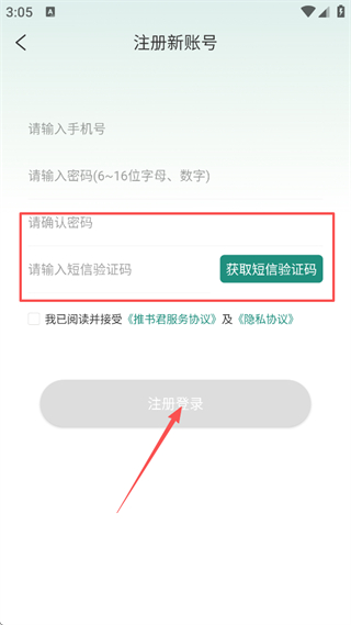 5、最后繼續(xù)填寫請(qǐng)確認(rèn)密碼,獲取驗(yàn)證碼并填寫,點(diǎn)擊注冊(cè)登錄,完成賬號(hào)注冊(cè)并登錄。