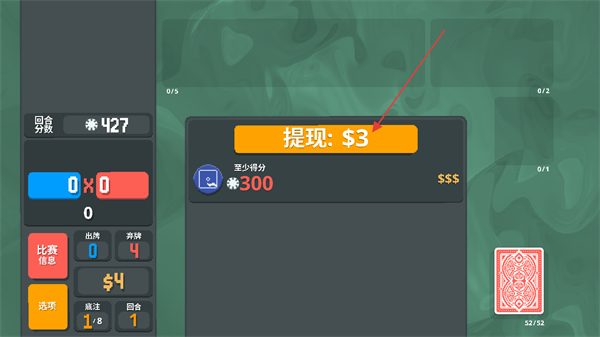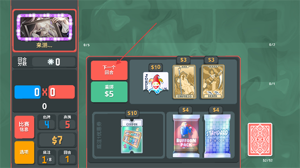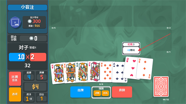 1、在小丑牌游戲環(huán)節(jié)中,當(dāng)手牌形成對子等牌型時(shí),點(diǎn)擊界面中的出牌按鈕,完成本輪出牌操作以積累回合分?jǐn)?shù)。