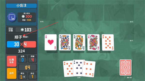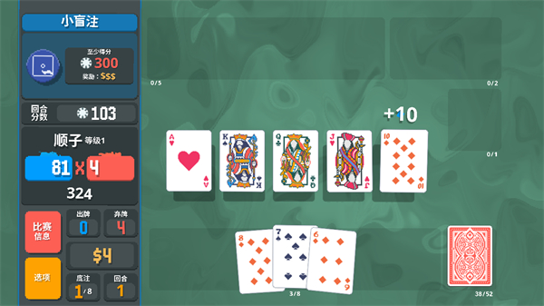 2、出牌后手牌形成順子牌型,回合分?jǐn)?shù)會隨之更新提升,此時(shí)可繼續(xù)通過出牌、棄牌等操作推進(jìn)當(dāng)前游戲流程。