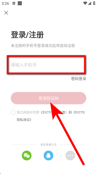3、在登錄注冊(cè)界面,輸入手機(jī)號(hào),勾選協(xié)議后,點(diǎn)擊發(fā)送驗(yàn)證碼。