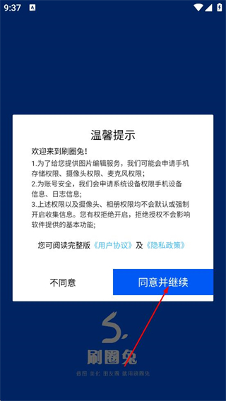 1、在溫馨提示彈窗中,點(diǎn)擊同意并繼續(xù),進(jìn)入刷圈免應(yīng)用頁(yè)面。