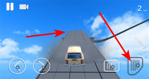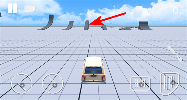 2、調(diào)整車輛方向與車速,駕駛車輛接近空中的方塊結(jié)構(gòu)障礙,這是熟悉特技場(chǎng)景障礙的關(guān)鍵步驟,逐步適配特技關(guān)卡的場(chǎng)景元素。