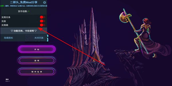 1、進(jìn)入游戲前,可開(kāi)啟無(wú)限光條無(wú)敵無(wú)限跳等功能,選好后點(diǎn)擊開(kāi)始按鈕進(jìn)入游戲,還能通過(guò)選項(xiàng)調(diào)整設(shè)置。