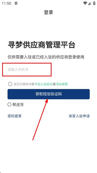 2、在手機(jī)登錄頁(yè)面填寫手機(jī)號(hào),勾選協(xié)議后,點(diǎn)擊獲取短信驗(yàn)證碼。