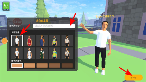 2、進入角色自定義界面后,選擇人物形象與昵稱,點擊下一個按鈕,角色創(chuàng)建的基礎操作,配置后會進入車輛選擇環(huán)節(jié),推進游戲流程。