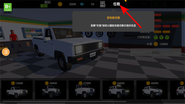 3、在車輛選擇界面點擊任務按鈕,這是查看游戲目標的核心操作,了解任務信息后可明確駕駛過程中的目標,助力后續(xù)的越野挑戰(zhàn)。