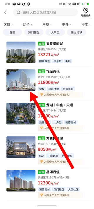 3、在樓盤列表中,點擊選擇目標房源,進入房源詳情頁。