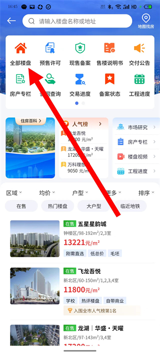 2、在新房頁面,點擊全部樓盤,查看所有樓盤列表。