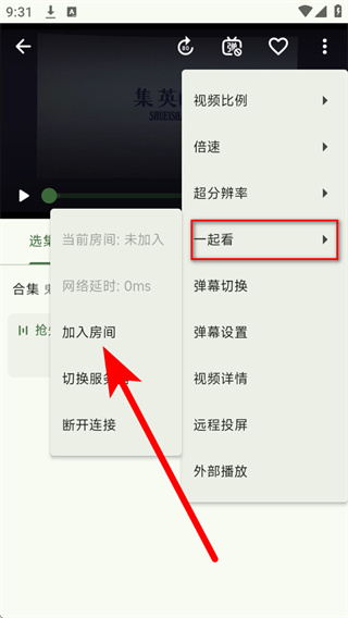5、在功能選項中找到一起看選項并點擊,隨后選擇加入房間,即可和他人同步觀看該動漫。