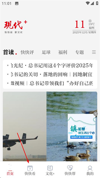 1、在現(xiàn)代plus首頁,點擊底部的快快看選項,進入視頻頁面。