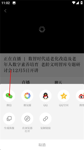 5、在分享窗口,選擇微信選項,可將該直播分享至微信平臺。