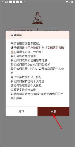 1、在使用協(xié)議隱私政策彈窗中點擊同意按鈕,進入登錄頁面。