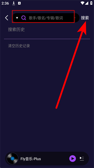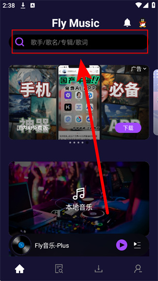 1、打開FlyMusic,點擊首頁頂部的搜索框。