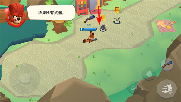 2、進(jìn)入場(chǎng)景后操控角色移動(dòng)至武器位置,這是收集裝備的基礎(chǔ)操作,靠近武器后可自動(dòng)拾取,提升角色的戰(zhàn)斗能力,為對(duì)戰(zhàn)鋪墊。