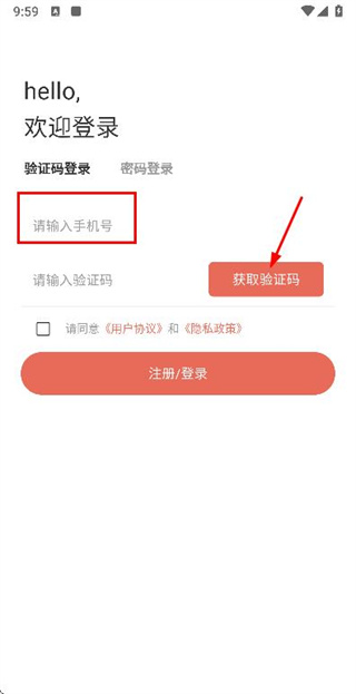 2、在登錄頁面填寫手機(jī)號,勾選協(xié)議后,點(diǎn)擊獲取驗(yàn)證碼。