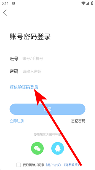 3、在賬號密碼登錄頁面,點擊短信驗證碼登錄,進入輸入手機號頁面。