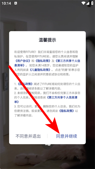 1、打開(kāi)fiture,在溫馨提示彈窗中,點(diǎn)擊同意并繼續(xù)。