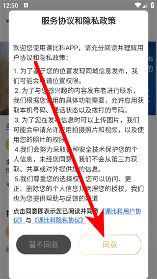 1、打開課比科,在彈出提示框,點(diǎn)擊同意,進(jìn)入首頁(yè)。