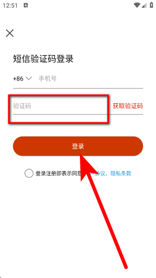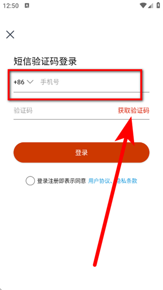 3、在登錄頁(yè)面,輸入手機(jī)號(hào),點(diǎn)擊獲取驗(yàn)證碼。