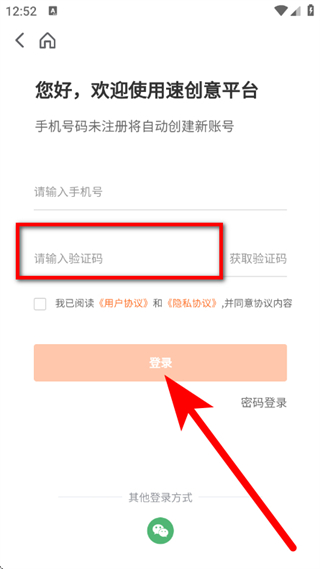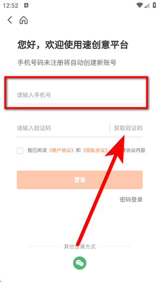 3、在速創(chuàng)意平臺登錄頁面,輸入手機號,點擊獲取驗證碼。