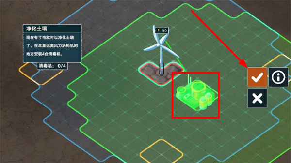 2、獲得電力后,選擇清毒機(jī)放置在荒地,按少設(shè)施覆蓋大區(qū)域的思路布置,完成后土壤將具備種植植被的條件。