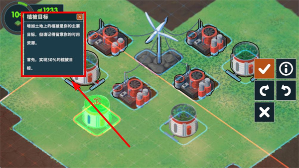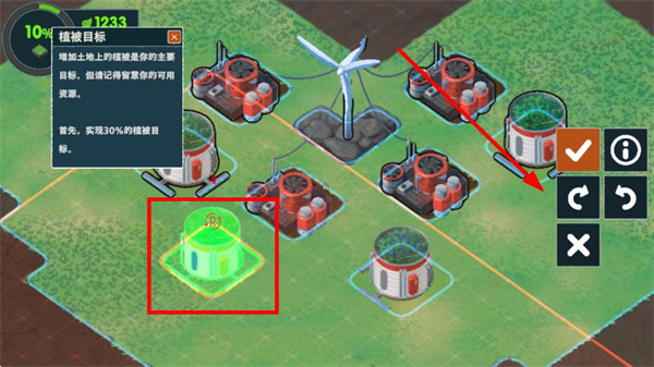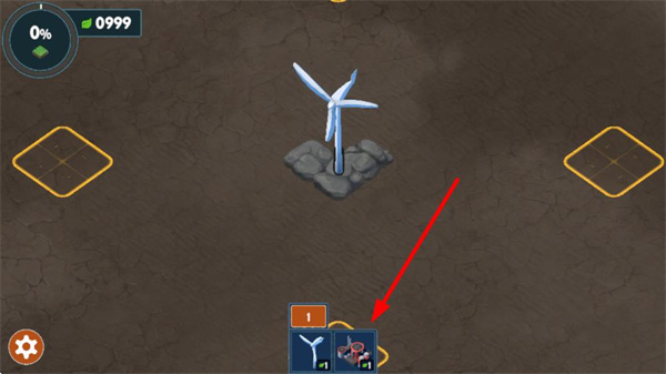 1、進(jìn)入游戲后選擇模式,先放置風(fēng)力渦輪機(jī)獲取電力,該設(shè)施需建在巖石區(qū)域,確認(rèn)位置后點(diǎn)擊對(duì)號(hào)完成建造。