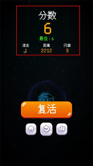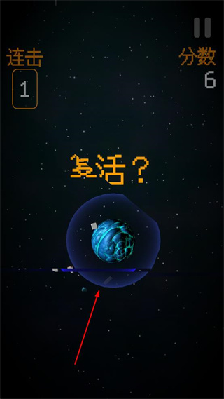3、若飛船碰撞到星球,界面會出現(xiàn)復(fù)活提示,此時可選擇是否進行復(fù)活操作以繼續(xù)游戲。