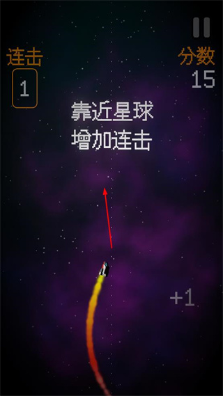 2、操控飛船靠近星球,增加連擊數(shù),同時留意界面顯示的連擊和分?jǐn)?shù)變化,持續(xù)推進游戲進程。