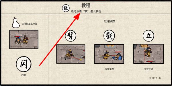 1、進(jìn)入教程,教程里可了解飲酒恢復(fù)生命值閃避等基礎(chǔ)操作,還有劈戳立等戰(zhàn)斗操作,長按蓄力或立棍能觸發(fā)對應(yīng)戰(zhàn)斗動(dòng)作。