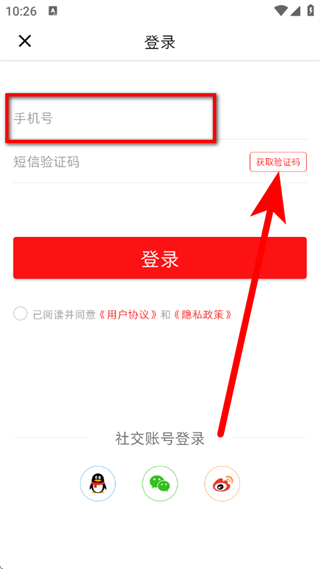 3、在登錄頁面,輸入手機號,點擊獲取驗證碼。