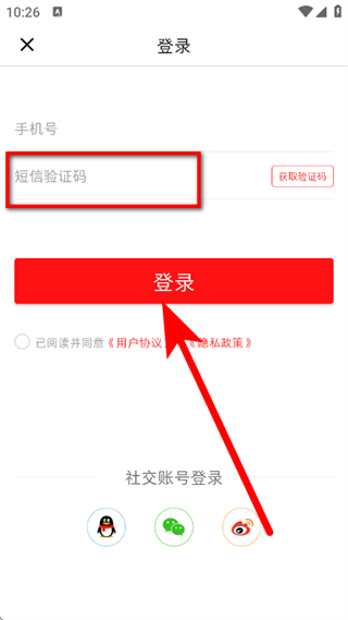 4、輸入短信驗證碼,勾選協(xié)議后,點擊登錄,完成登錄操作。