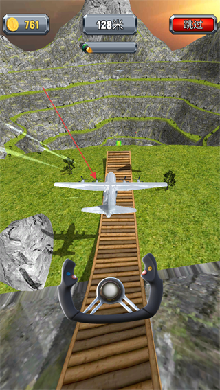 2、通過操控手柄調(diào)整飛機(jī)方向,在木橋路段前進(jìn),累計(jì)滑行至128米,獲取金幣。