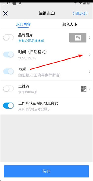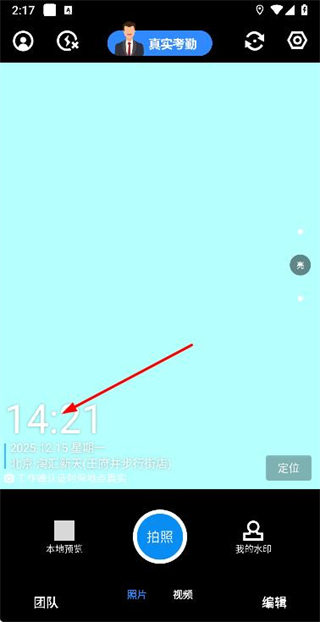 1、在拍照頁面點擊時間區(qū)域,進入編輯水印頁面。