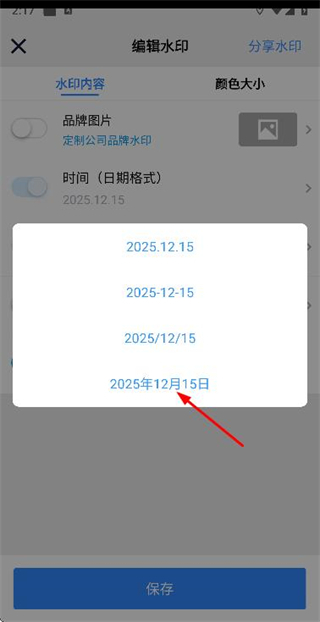 2、在編輯水印頁面點擊時間選項,彈出日期格式選擇列表。