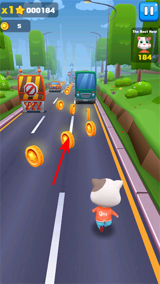2、遇到道路上的金幣時,向箭頭指引的區(qū)域移動角色,收集金幣積累資源,這是提升游戲收益的核心操作。
