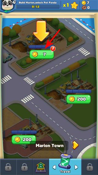 4、在城鎮(zhèn)界面,點擊箭頭指引的金幣選項,消耗對應(yīng)數(shù)量的金幣解鎖區(qū)域,這是推進(jìn)城鎮(zhèn)建設(shè)的操作。