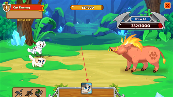 2、持續(xù)指揮貓咪攻擊,敵方野豬血量下降,同時(shí)積累戰(zhàn)斗進(jìn)度值。