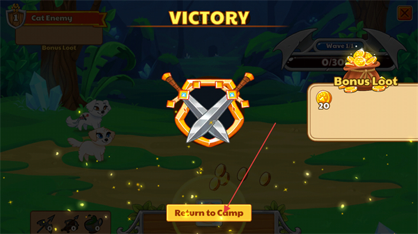 4、戰(zhàn)斗勝利顯示VICTORY,獲得獎(jiǎng)勵(lì),點(diǎn)擊ReturntoCamp返回營(yíng)地。