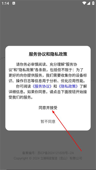 1、在立小臻的服務(wù)協(xié)議和隱私政策彈窗中,點擊同意并接受,進(jìn)入登錄頁面。