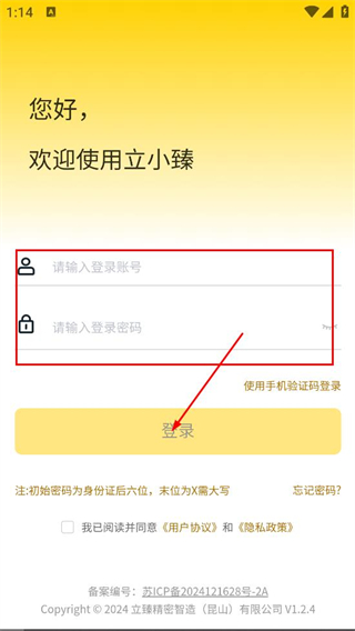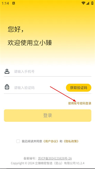 2、在立小臻登錄頁面,點擊使用賬號密碼登錄選項,切換至賬號密碼登錄界面。