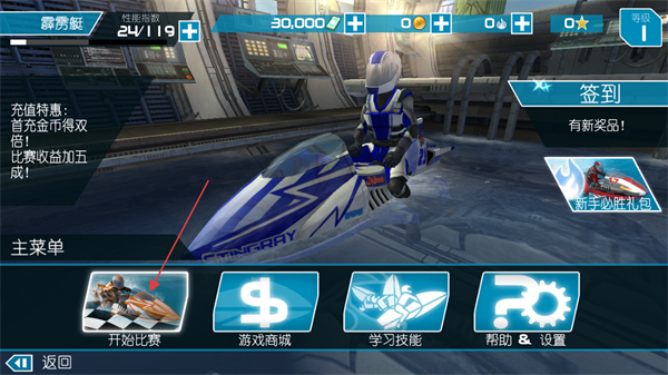 1、在主界面選擇當(dāng)前載具霹靂艇,點(diǎn)擊開(kāi)始比賽進(jìn)入賽事選擇環(huán)節(jié),同時(shí)可通過(guò)其他按鈕進(jìn)入游戲商城、學(xué)習(xí)技能等功能模塊。