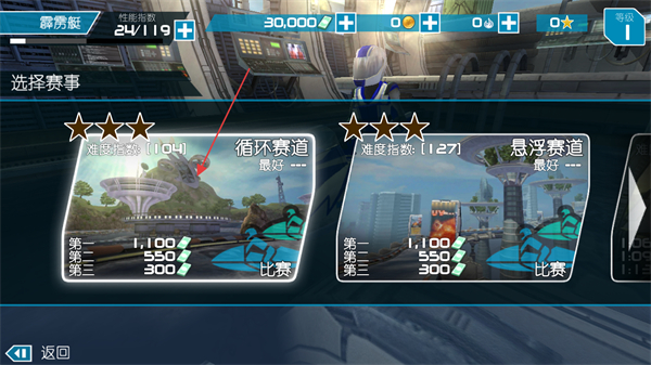 2、進(jìn)入賽事選擇界面后,可挑選循環(huán)賽道等賽事,不同賽道對(duì)應(yīng)不同難度指數(shù)與獎(jiǎng)勵(lì),點(diǎn)擊賽道旁的比賽按鈕即可開(kāi)啟對(duì)應(yīng)賽事。