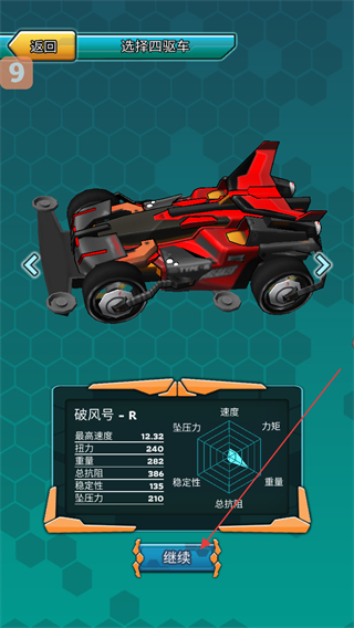 1、在選擇四驅(qū)車界面,選定破風號-R后,可查看其最高速度、扭力等屬性,確認后點擊繼續(xù)按鈕,進入后續(xù)的游戲流程。