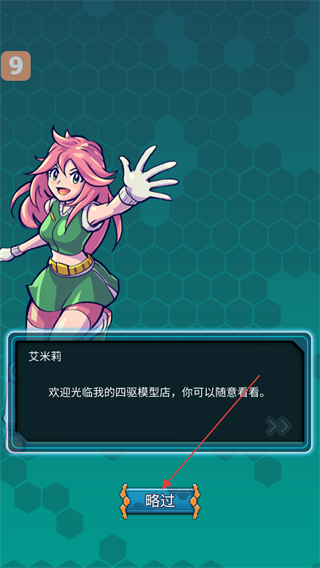 2、在對話界面中,查看艾米莉的歡迎光臨我的四驅(qū)模型店,你可以隨意看看的臺詞后,點擊略過按鈕,快速推進這段對話環(huán)節(jié)。