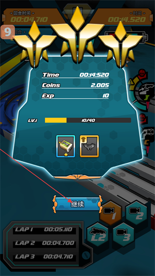 4、比賽結(jié)束后,查看結(jié)算界面的Time、Coins等數(shù)據(jù),獲取對應的獎勵,點擊繼續(xù)按鈕回到游戲相關界面,推進后續(xù)進程。