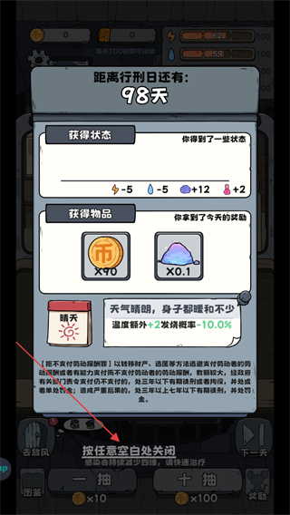 3、該界面展示每日獲得的狀態(tài)與物品,查看相關(guān)內(nèi)容后,按任意空白處關(guān)閉此界面,繼續(xù)后續(xù)的游戲進(jìn)程。