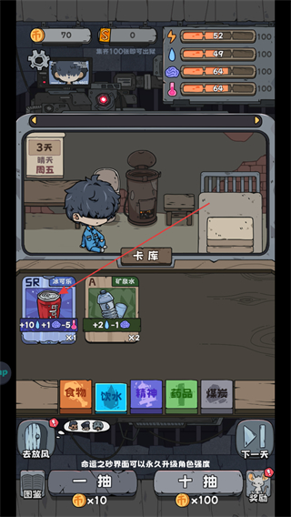 4、在卡庫界面中,可查看不同分類下的卡牌如飲水類的冰可樂,了解卡牌屬性,后續(xù)可使用卡牌提升角色狀態(tài)。