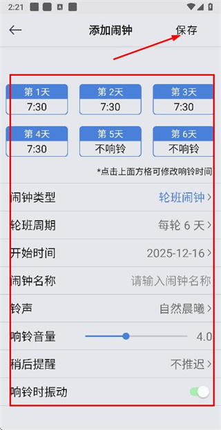 3、在添加鬧鐘頁面完善時間、名稱等信息后,點擊保存按鈕完成輪班鬧鐘的添加。